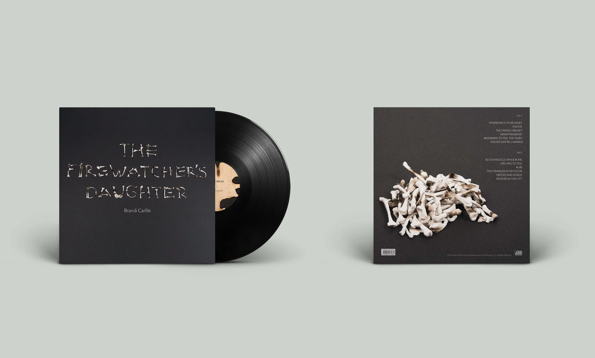 A reimagining of the album design for Brandi Carlile’s The Firewatcher’s Daughter. I sculpted the bones from clay and then burned them with matches. The record sticker was made by burning paper that I stained with tea.